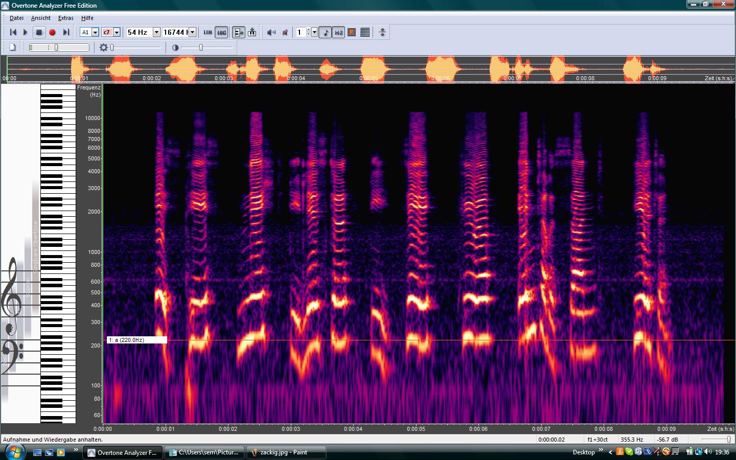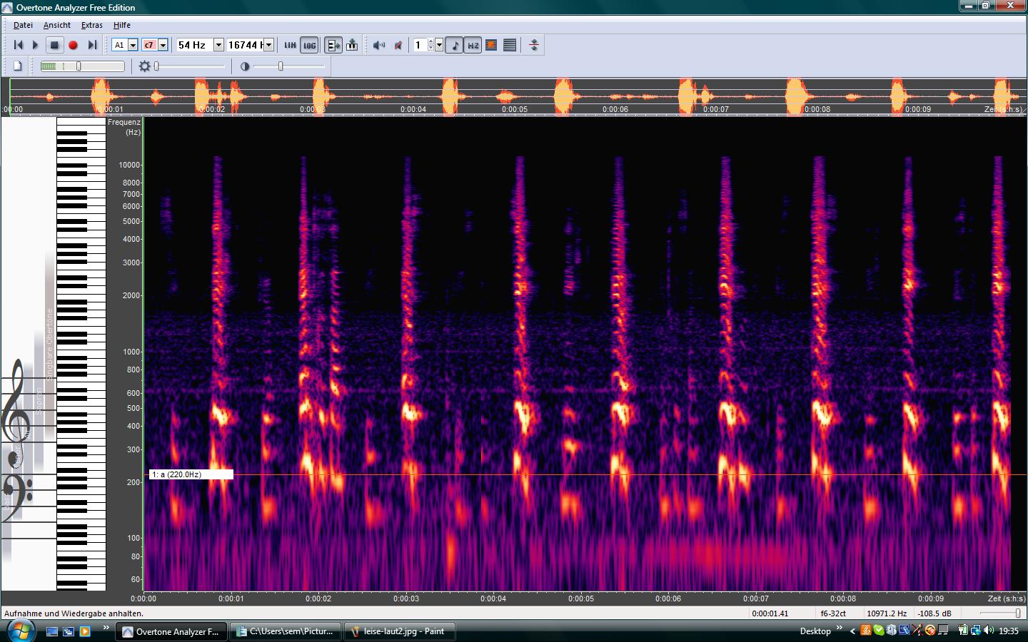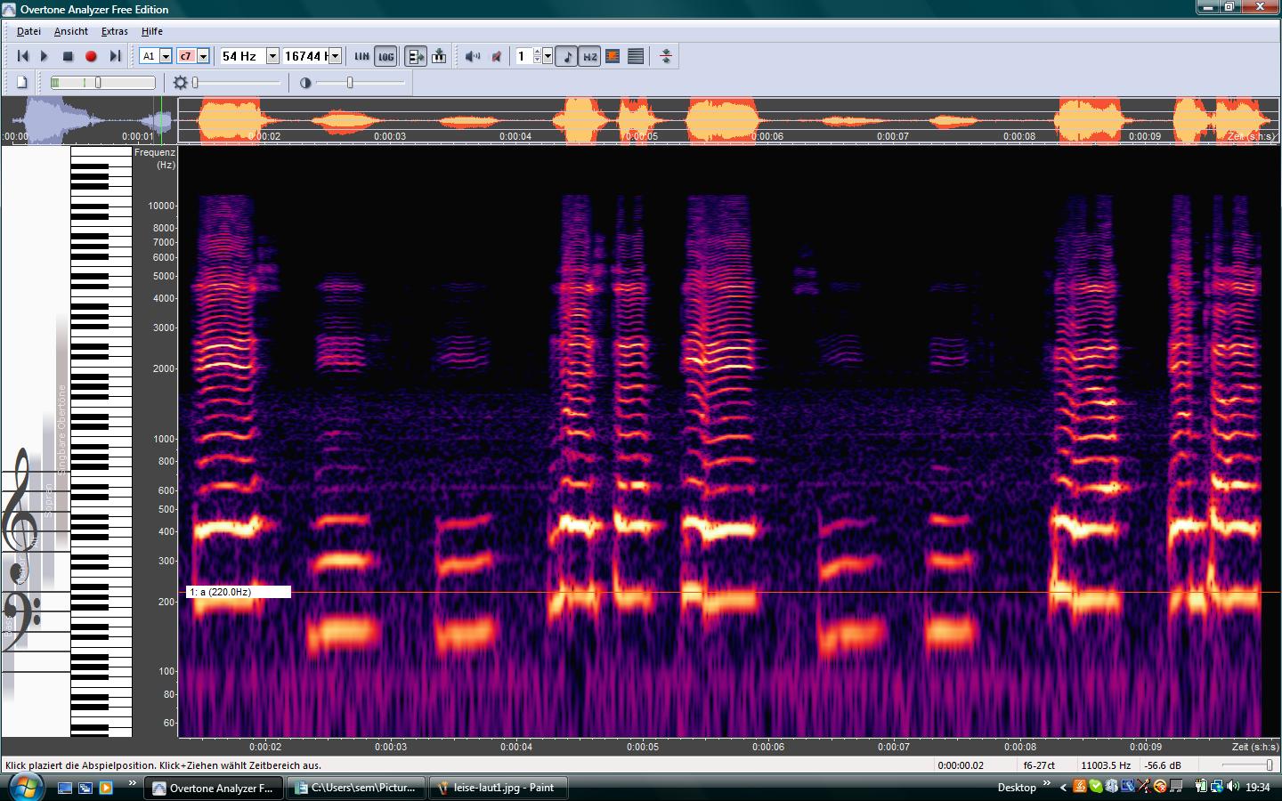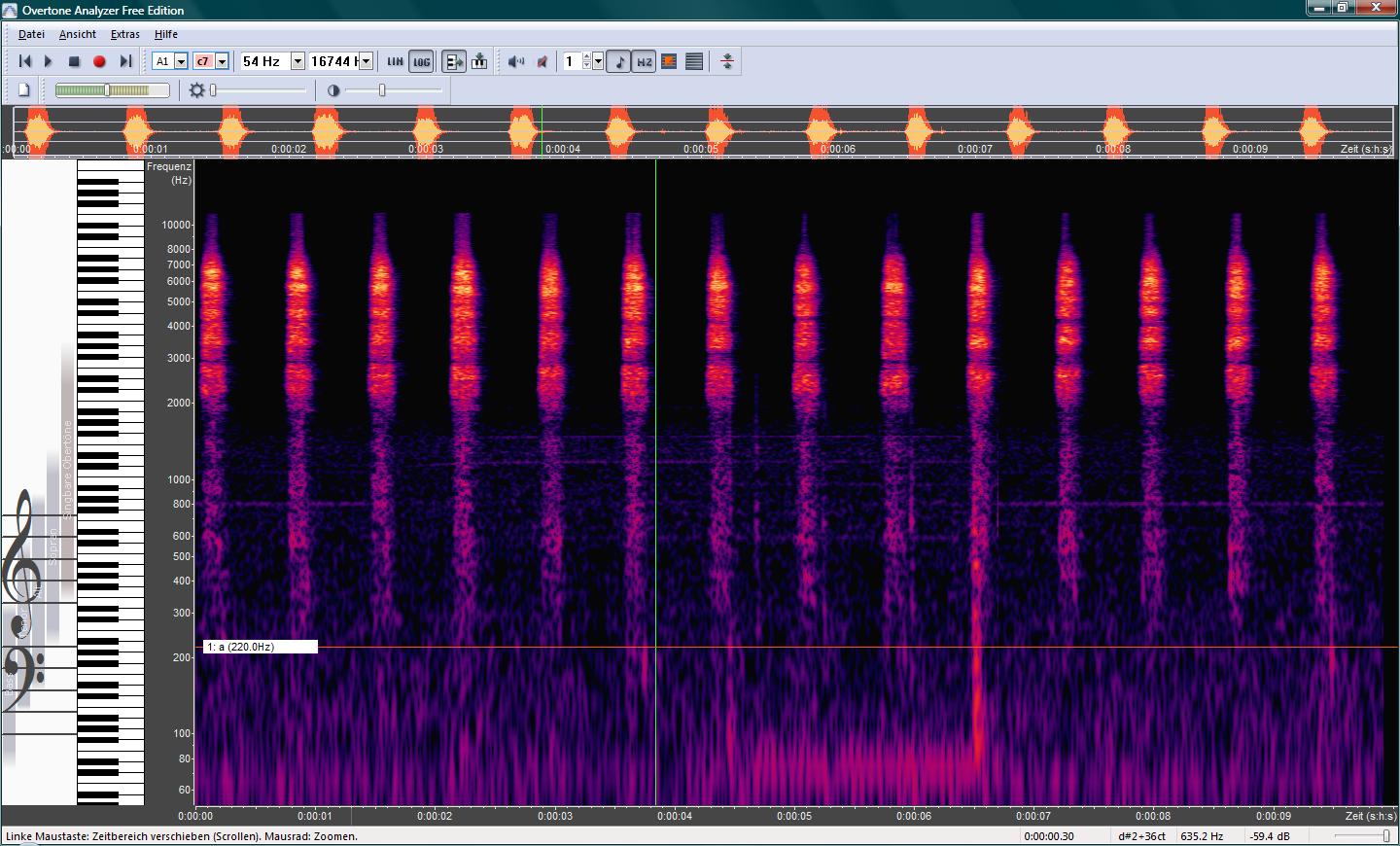 Die Tonqualität ist erkennbar an der Frequenz-Skala. Um so mehr gelb zu sehen ist um so voller und SCHÖNER klingt Ihr Sprechton für den Zuhörer. Die Klangfarbe der Eigenwahrnehmung ist dann sehr nahe an dem Klangerlebnis, das Sie dem Zuhörer bieten. Sie sollten diese Übungen laut trainieren damit sich die Klangtechnik entwickeln kann.